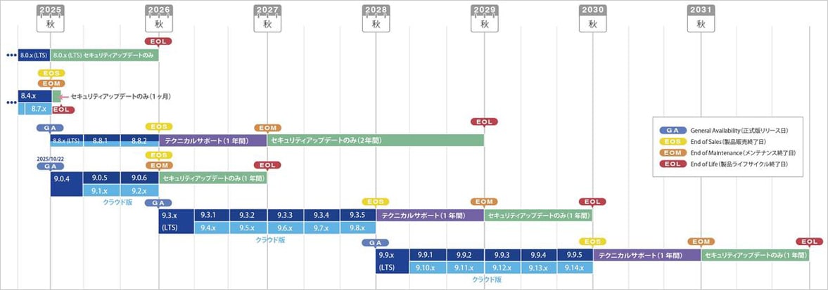 「バージョンアップのタイミングがわからない」「頻繁なアップデートは負担」という企業にとって、この長期サポート体制は大きな安心材料です。